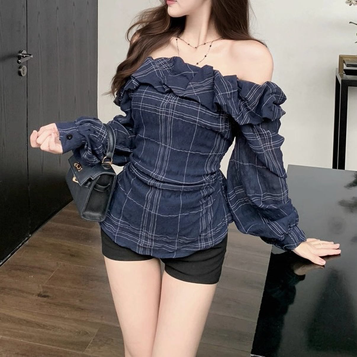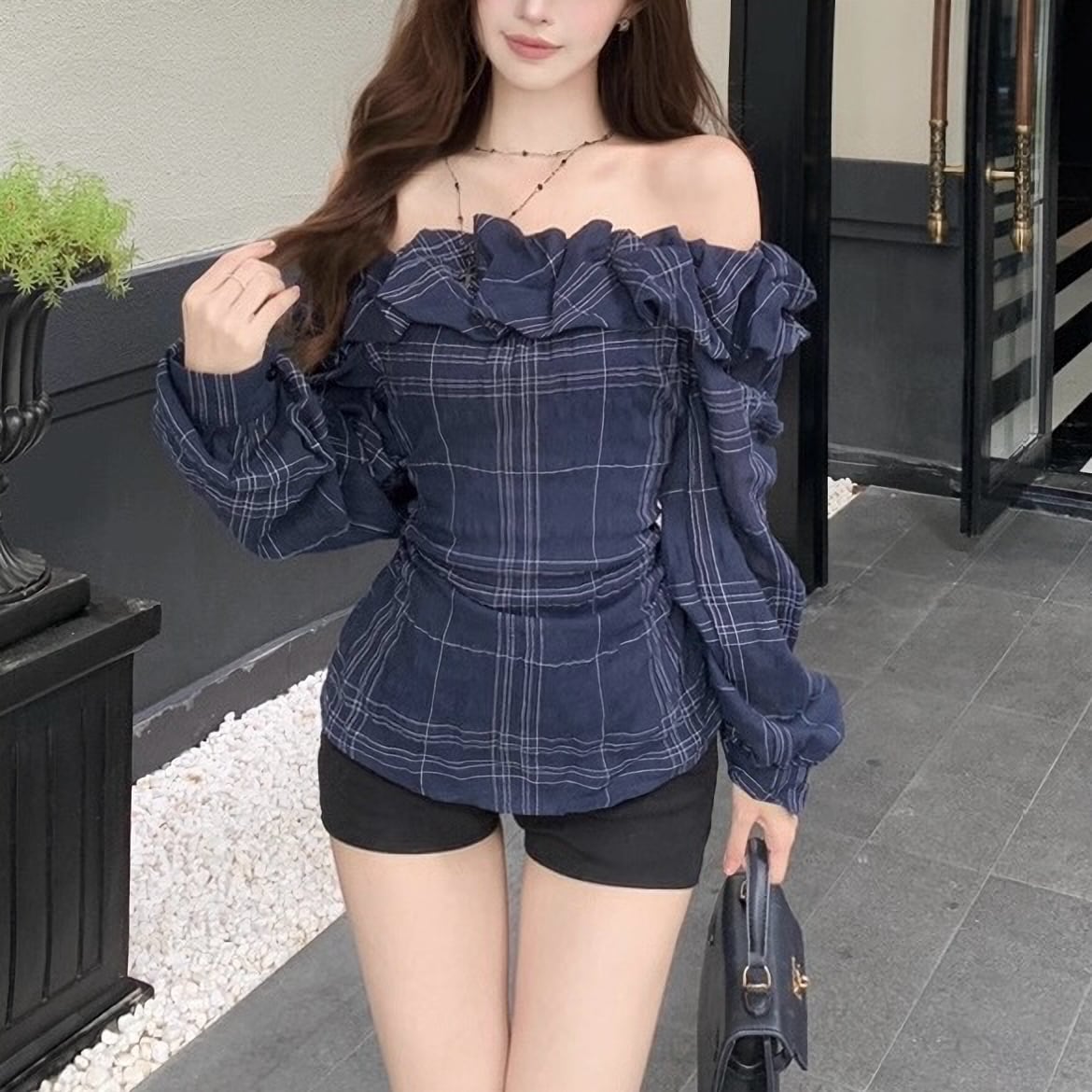 オフショルダー 肩出し ネイビー フリル ブラウス