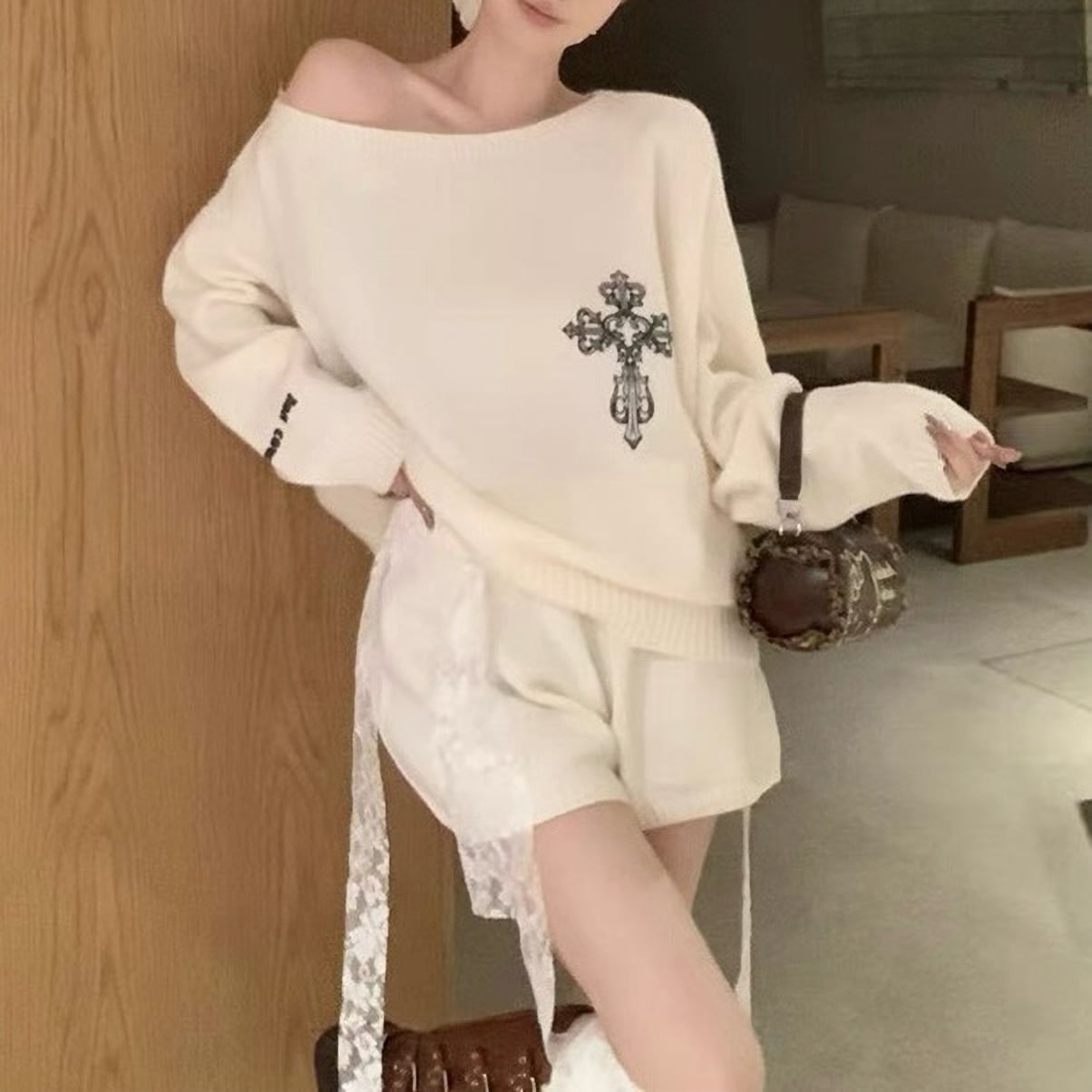 タイト パンツ ショートパンツ ジャージ スウェット スエット 十字架 ニット オフショルダー