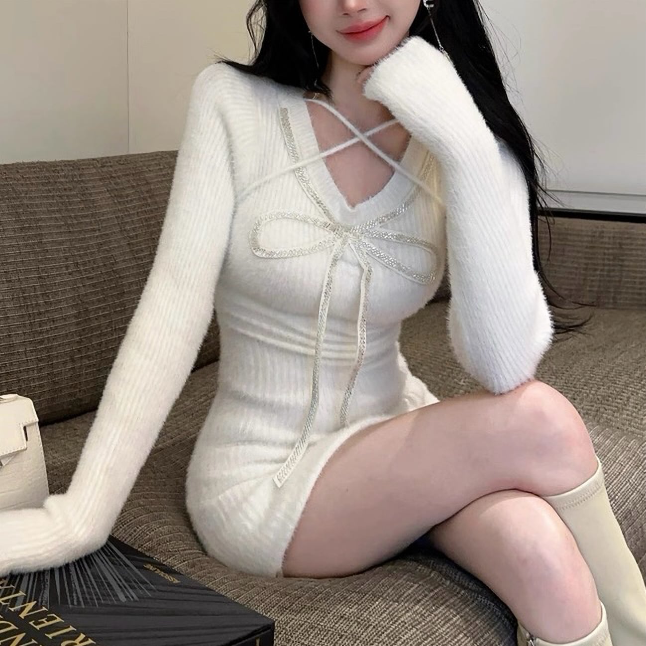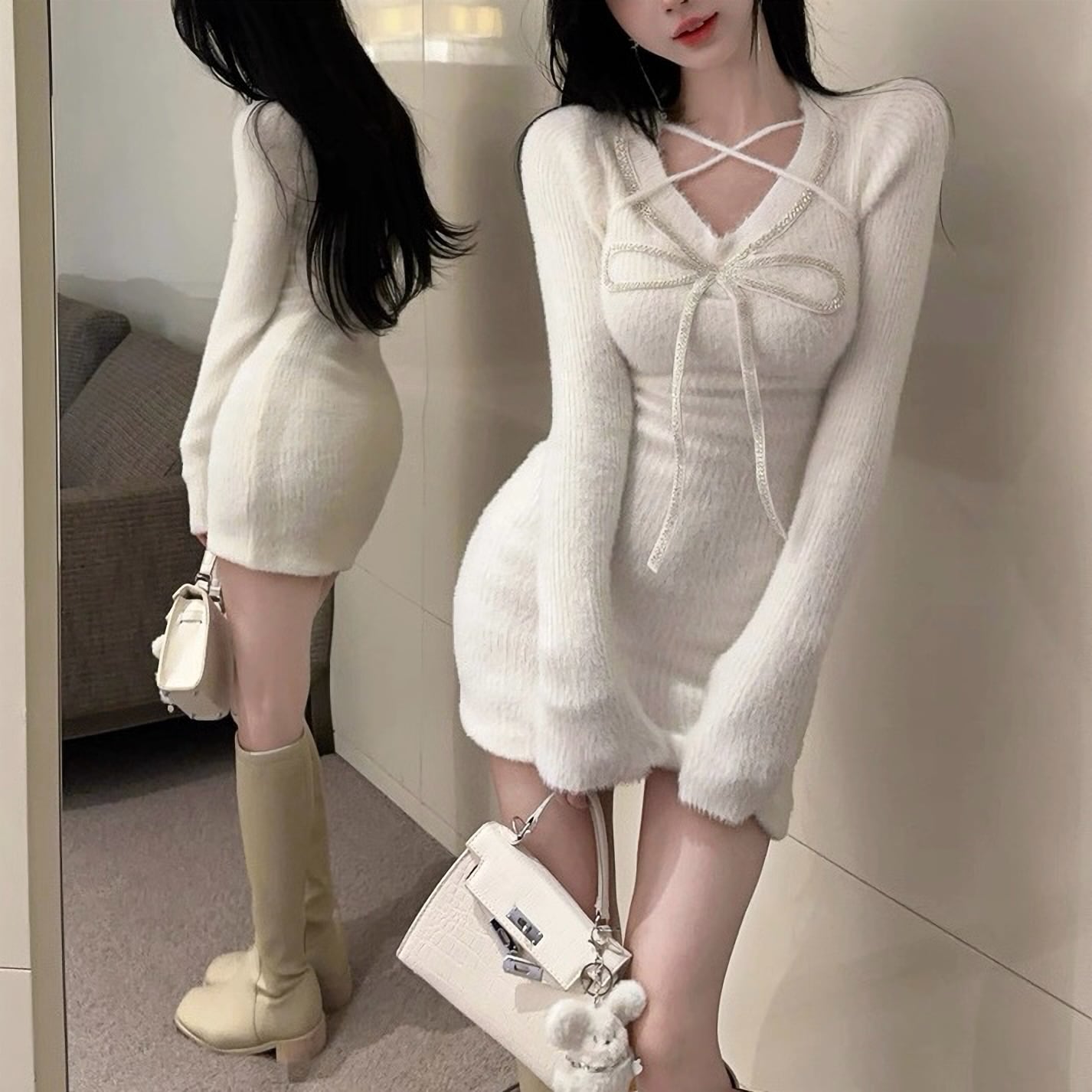 ミニ丈 ガーリー 可愛い 長袖 秋 冬 リボン