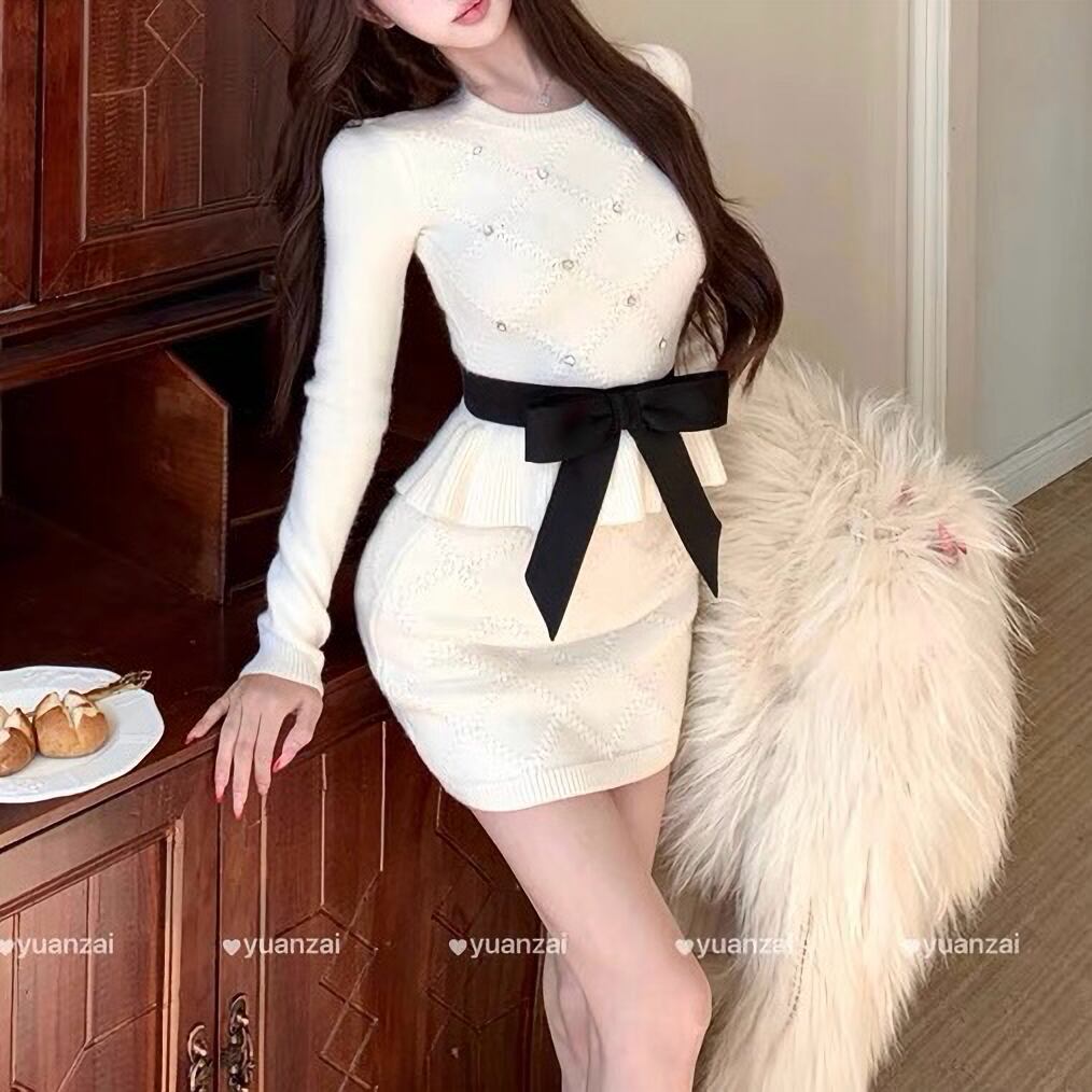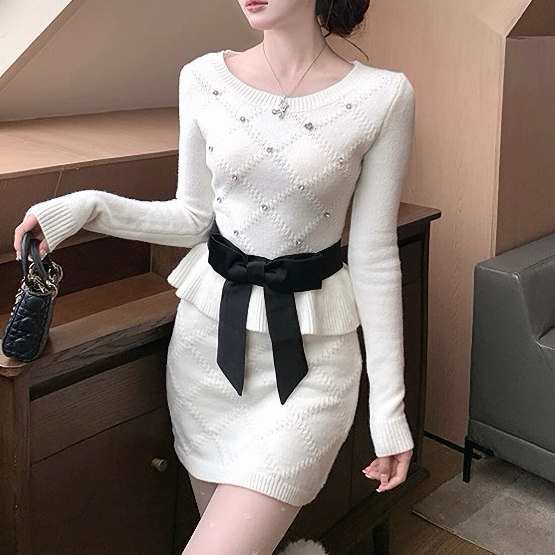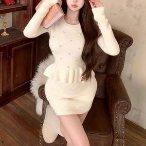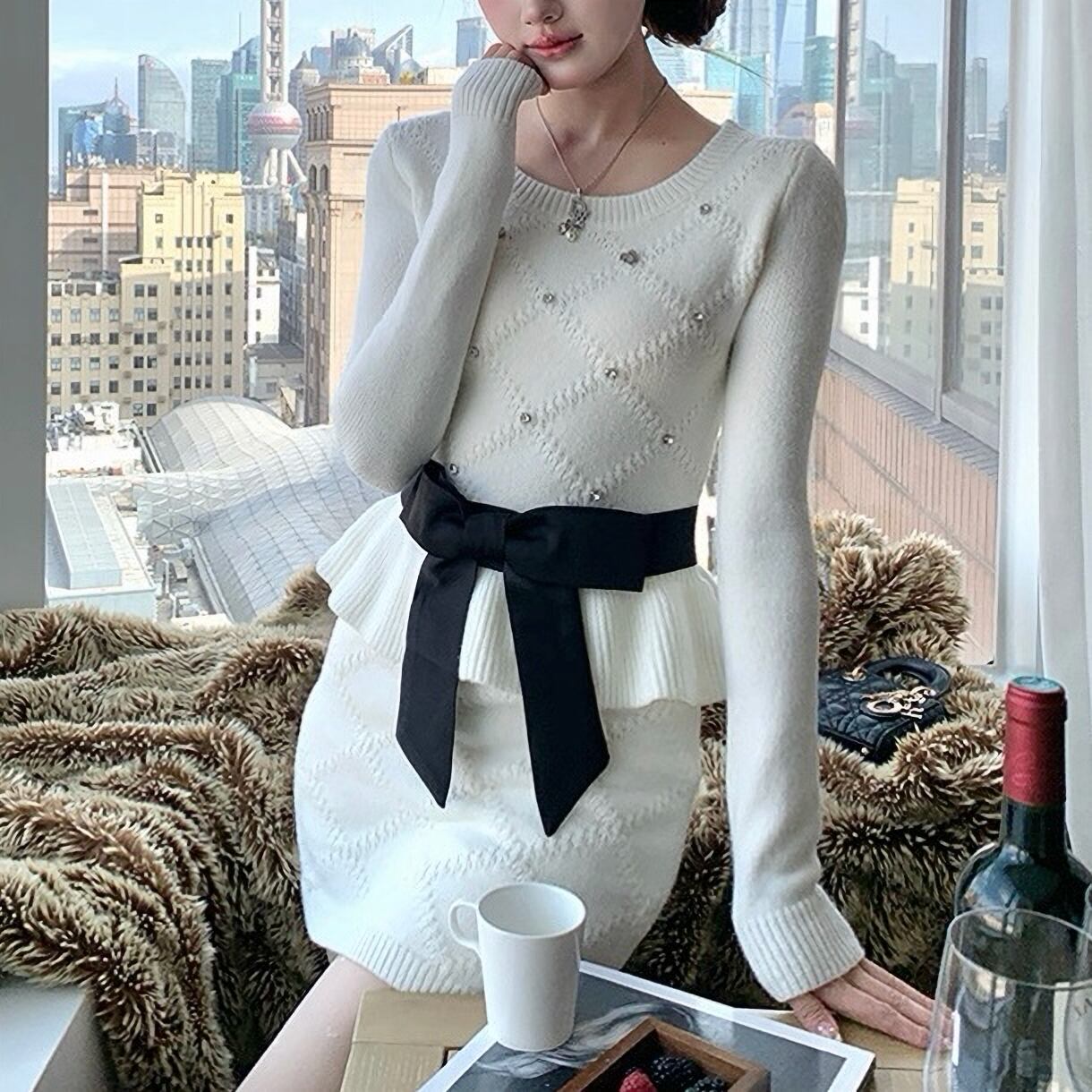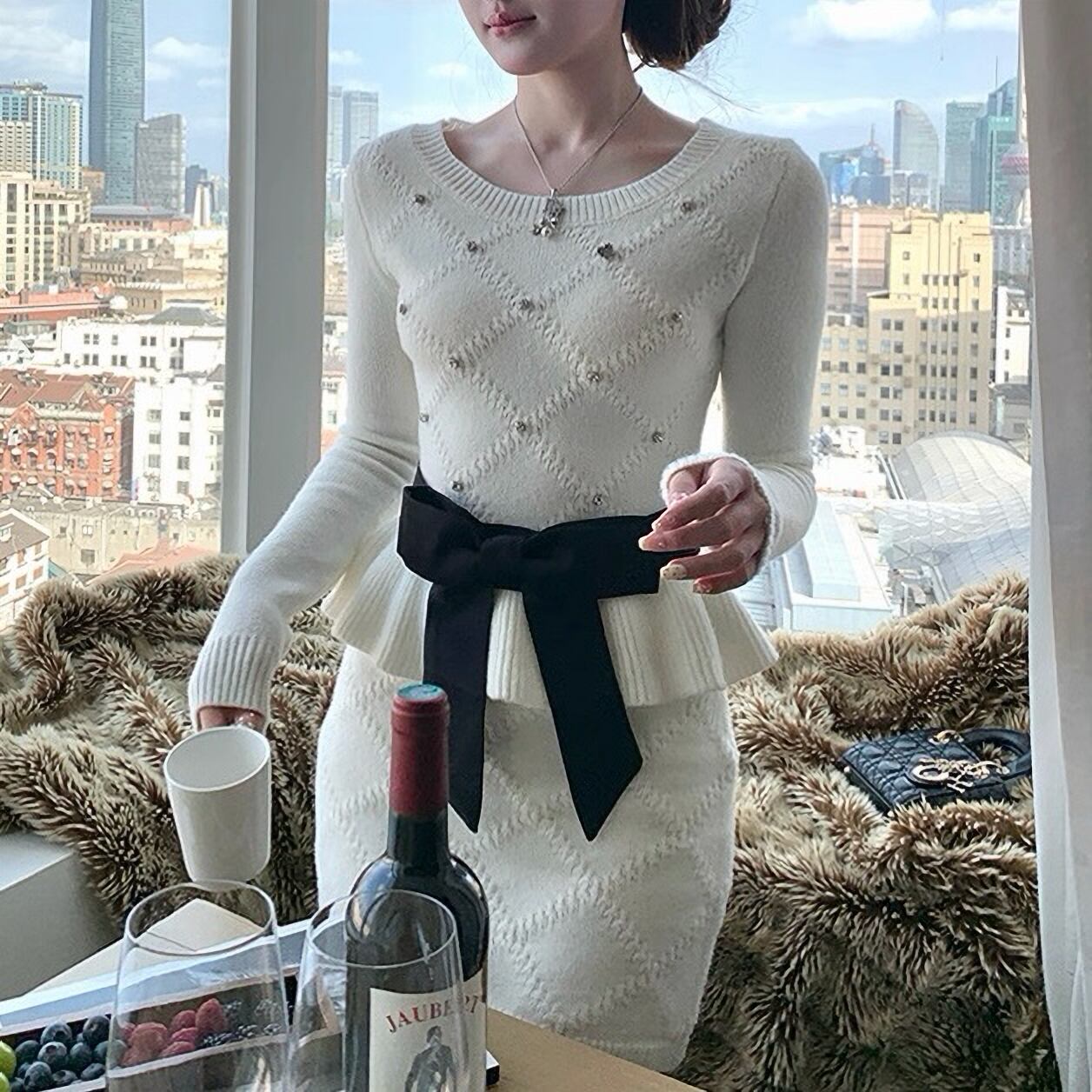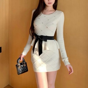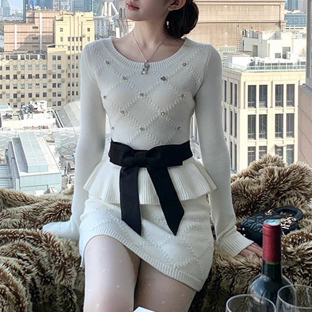 ミニ ミニ丈 ショート丈 上品 セクシー 2点セット 長袖 冬 ニット ビジュー ペプラム リボン