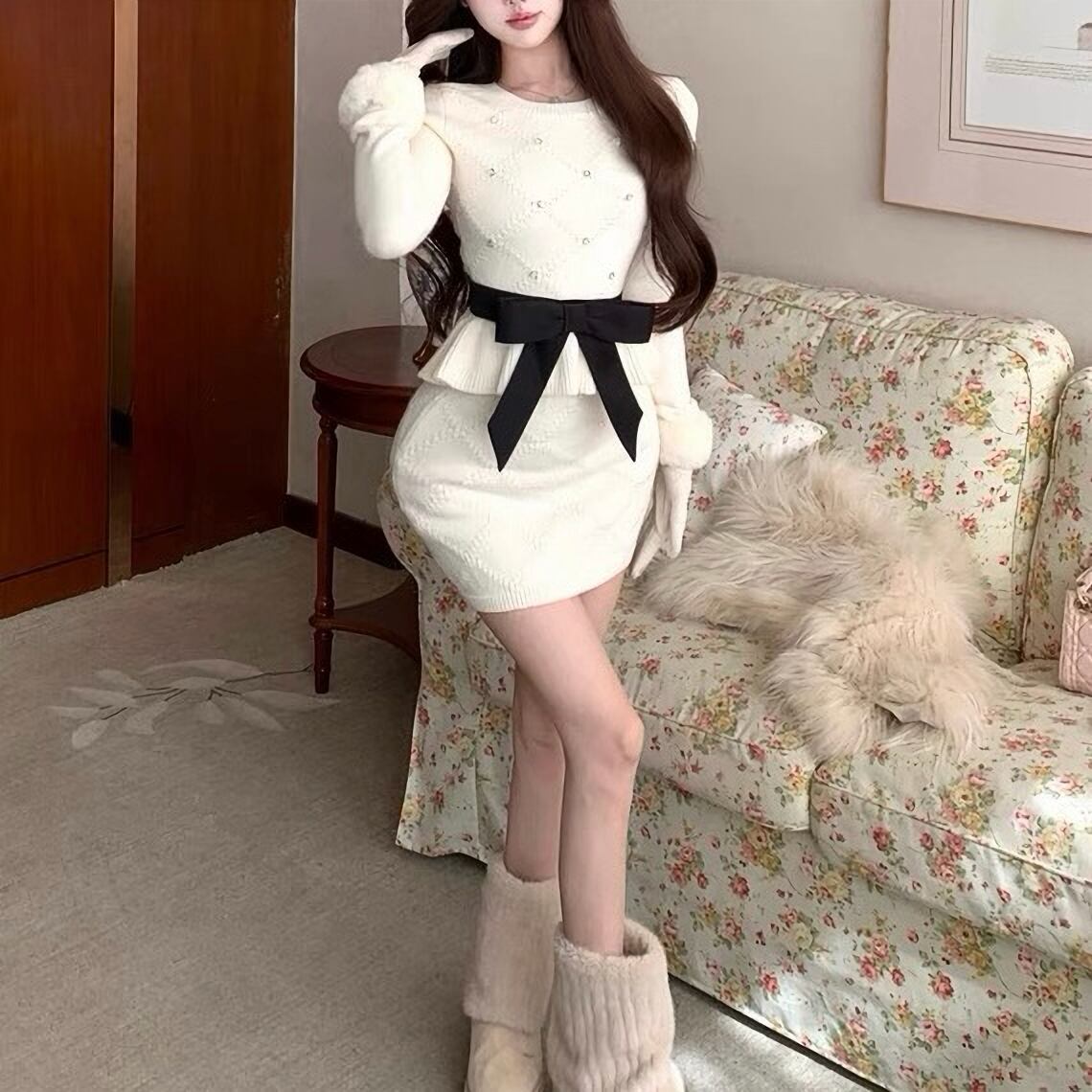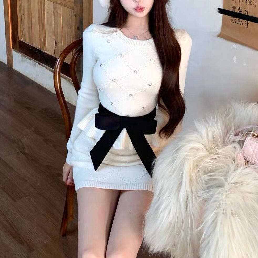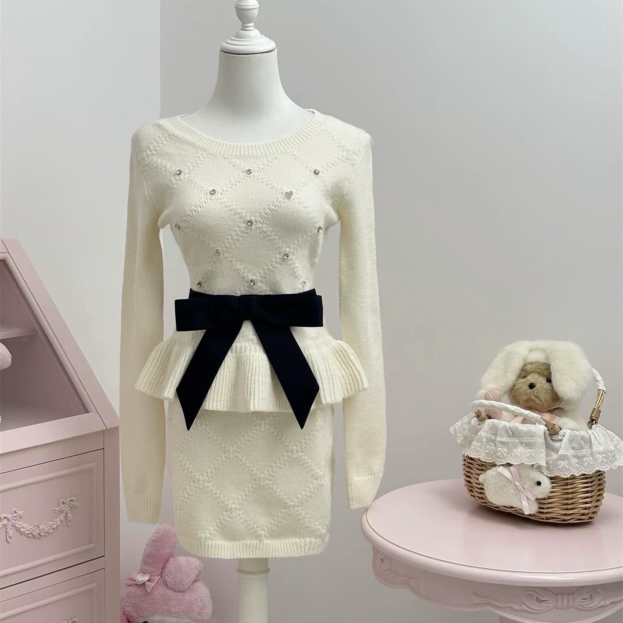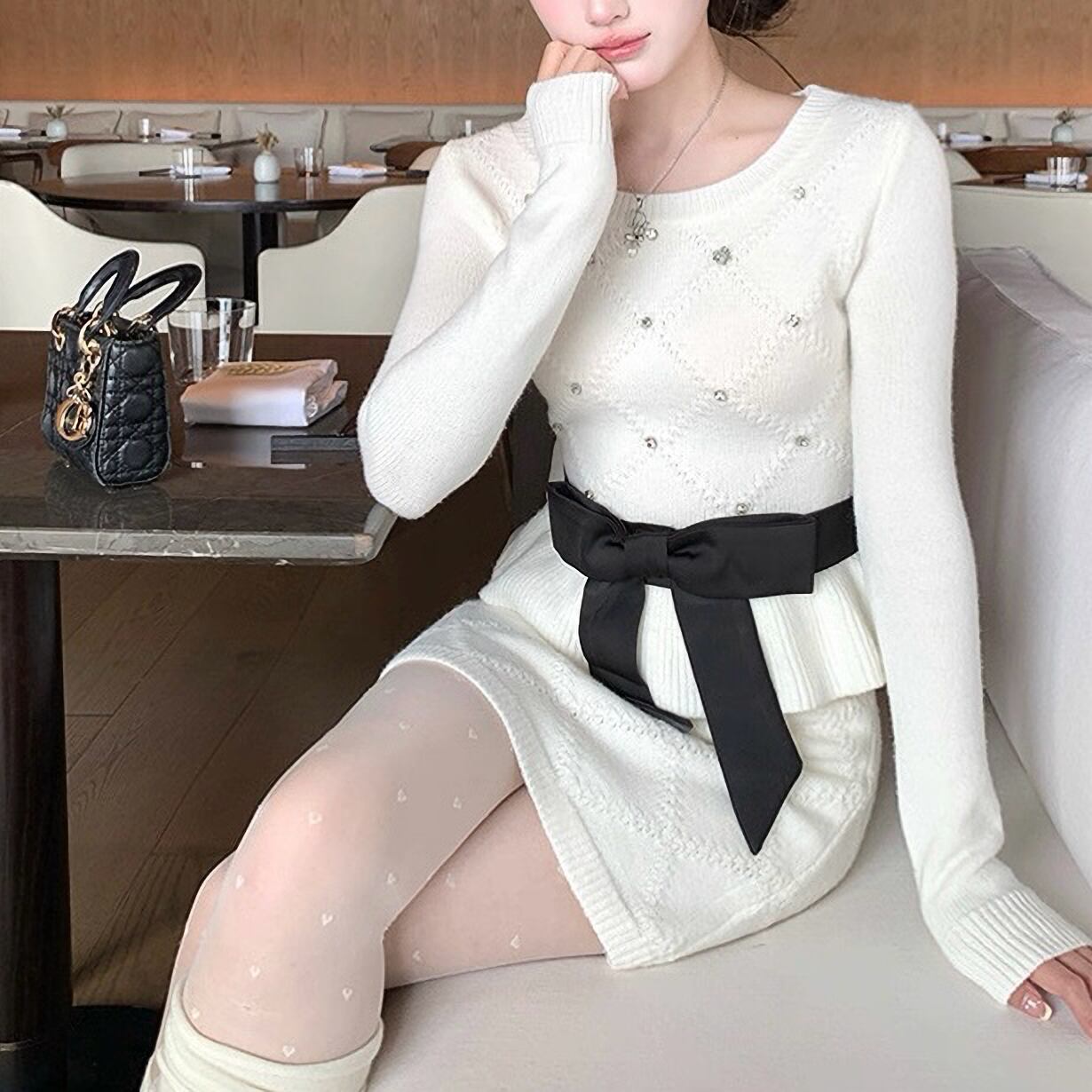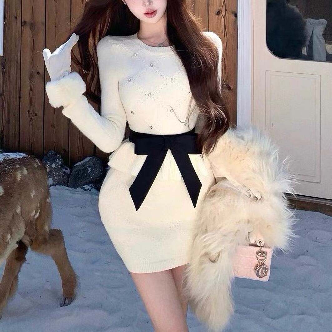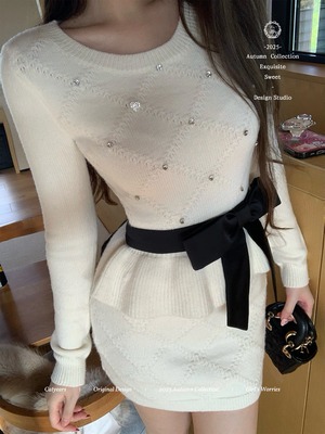 ミニ ミニ丈 ショート丈 上品 セクシー 2点セット 長袖 冬 ニット ビジュー ペプラム リボン