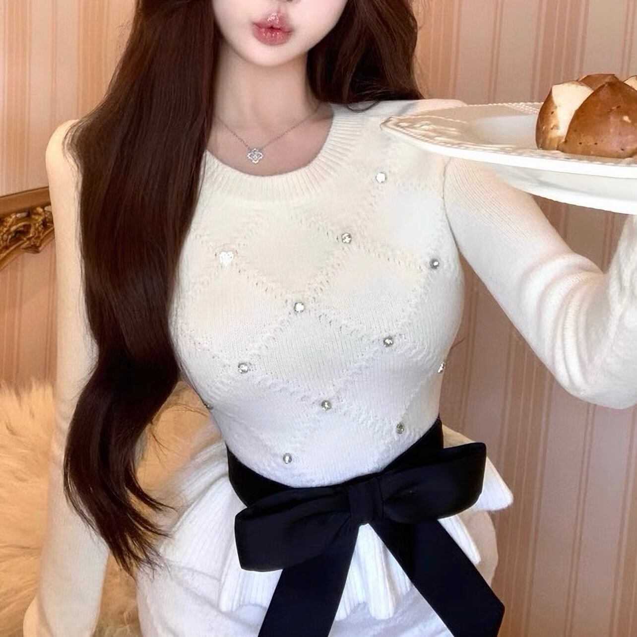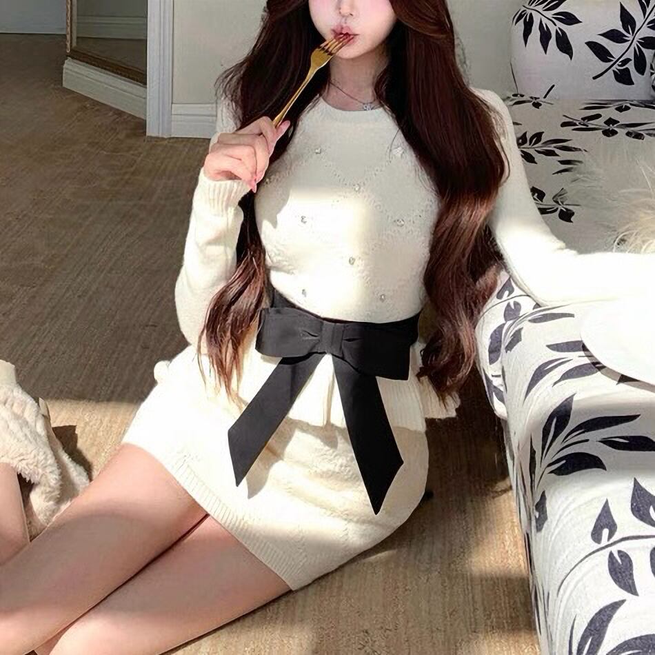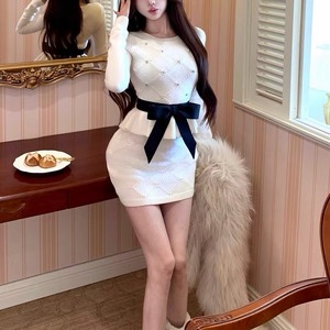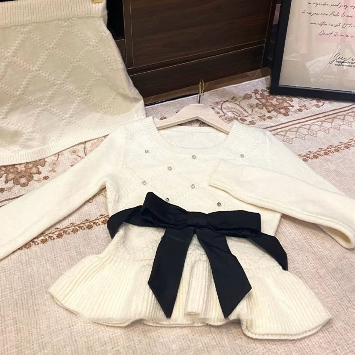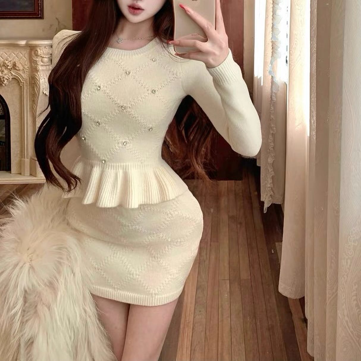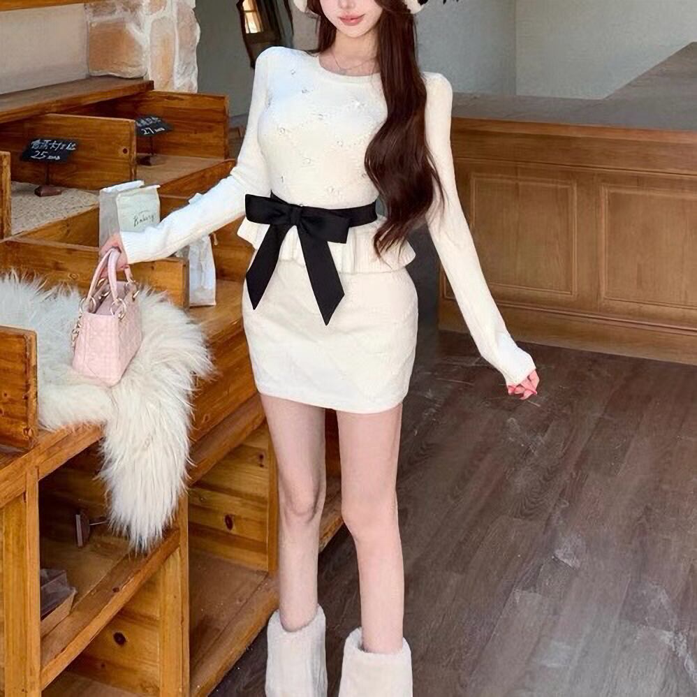ミニ ミニ丈 ショート丈 上品 セクシー 2点セット 長袖 冬 ニット ビジュー ペプラム リボン
