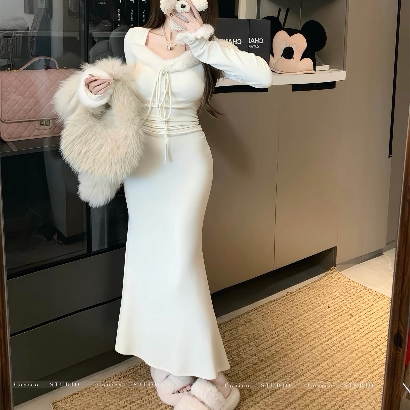 可愛い 長袖 秋 冬 ニット リブ タイト ファー