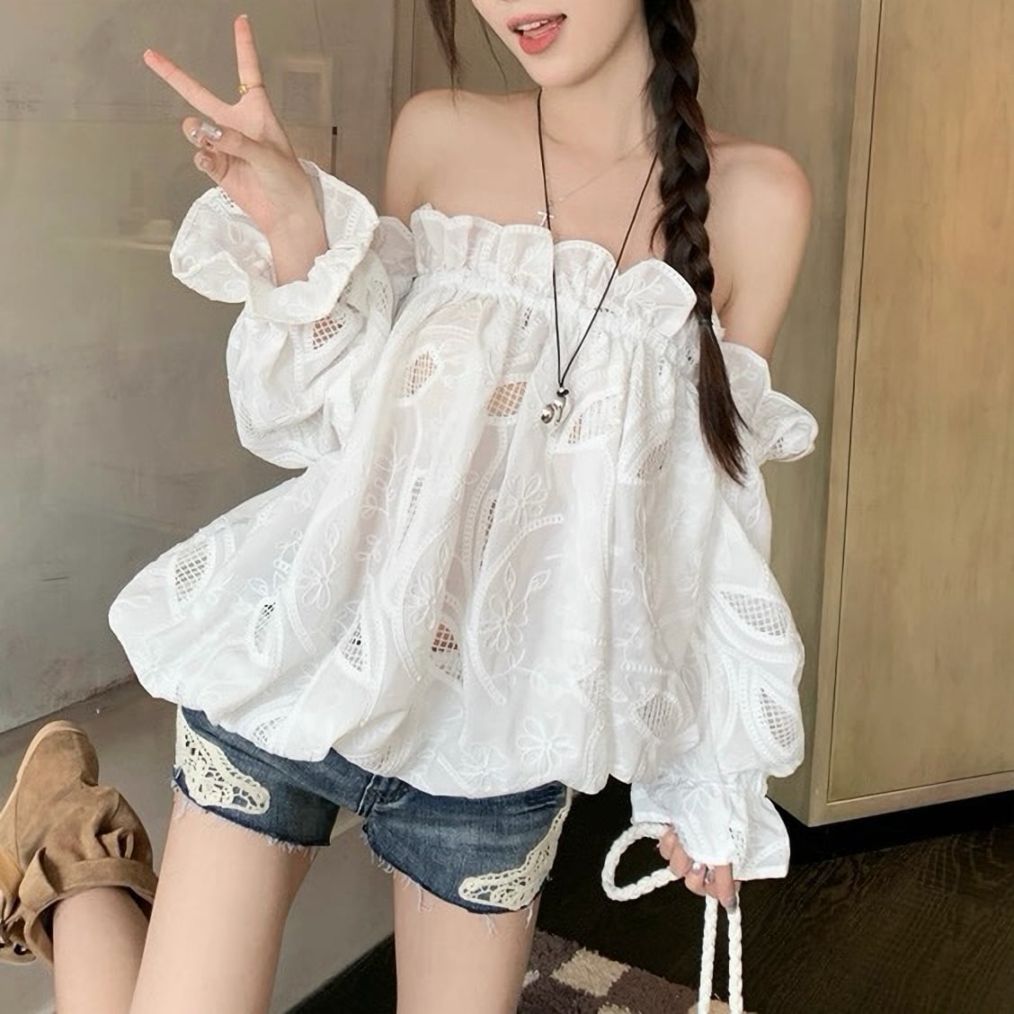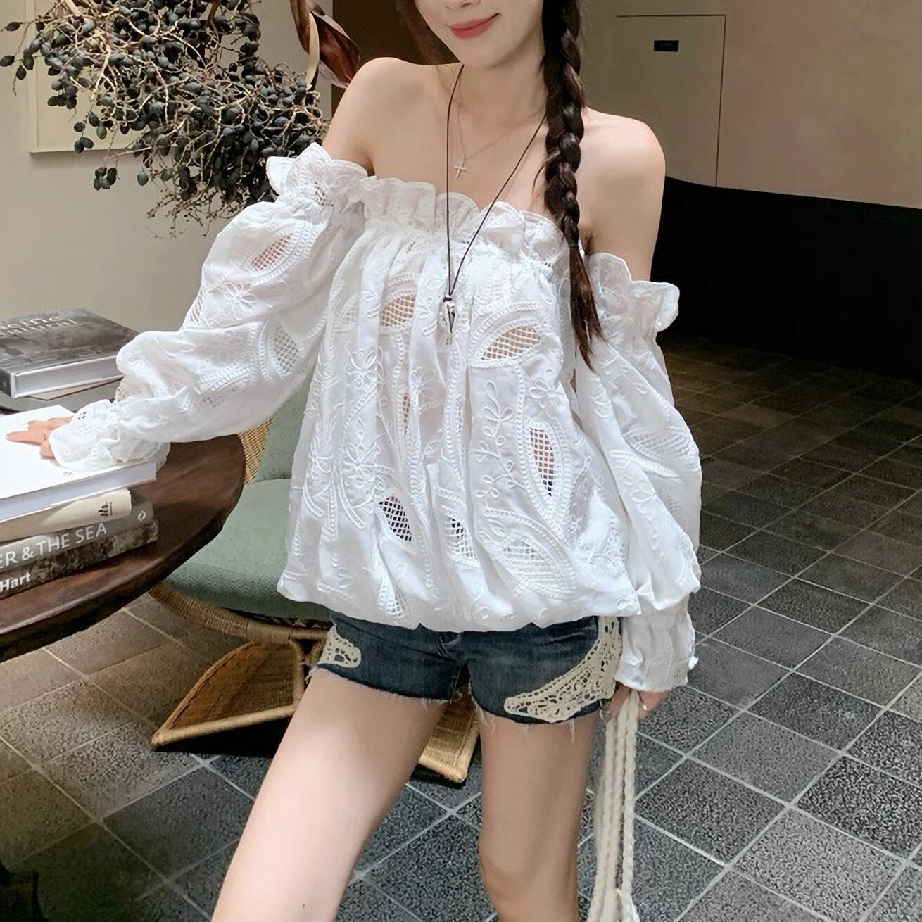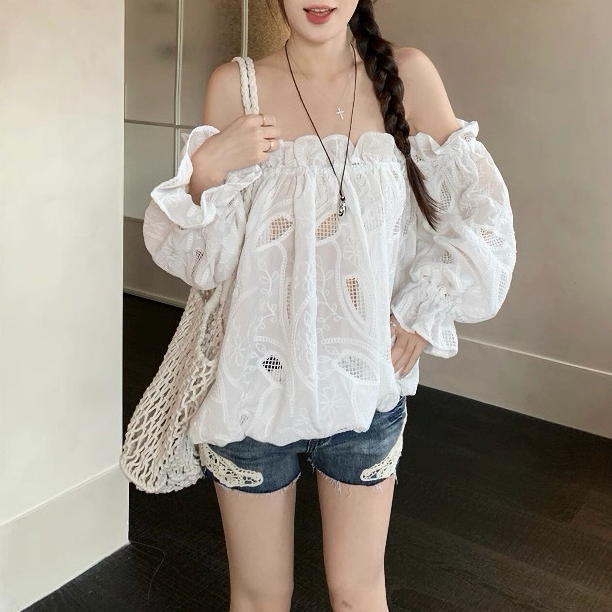 肩出し レース シフォン シャツ セクシー