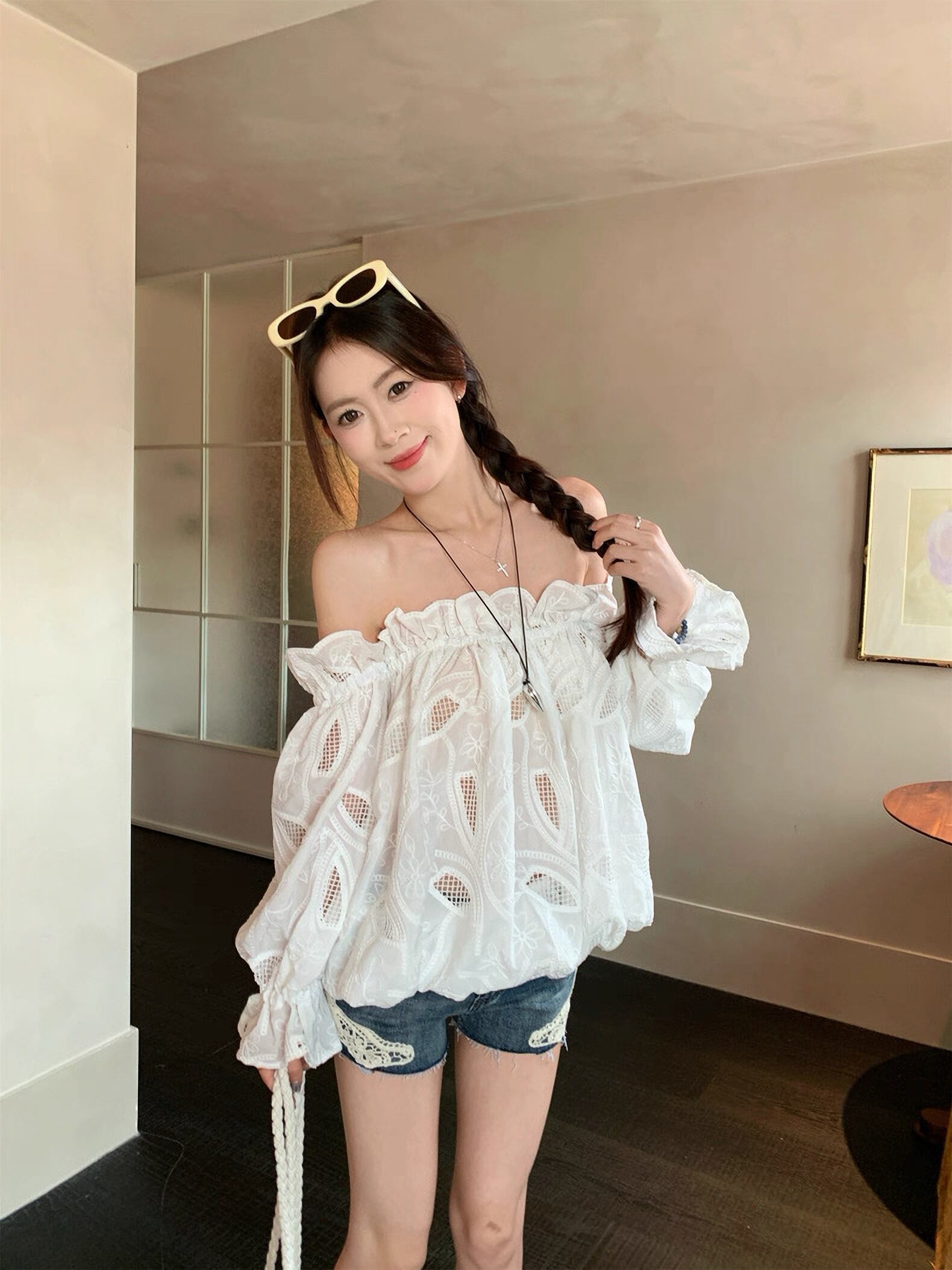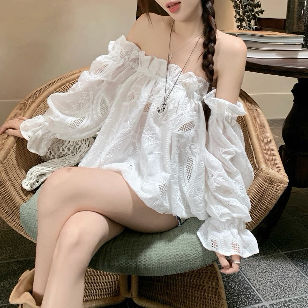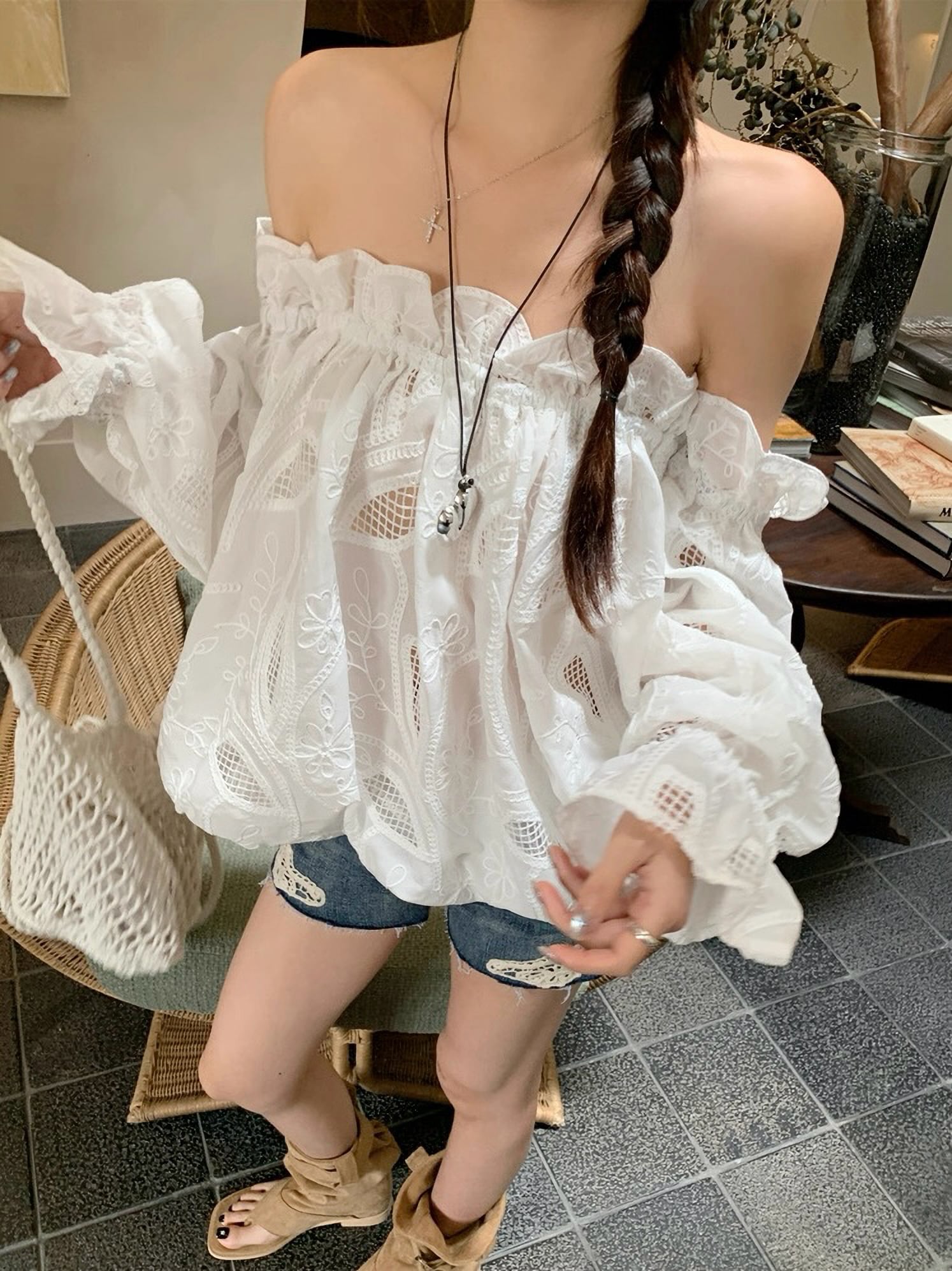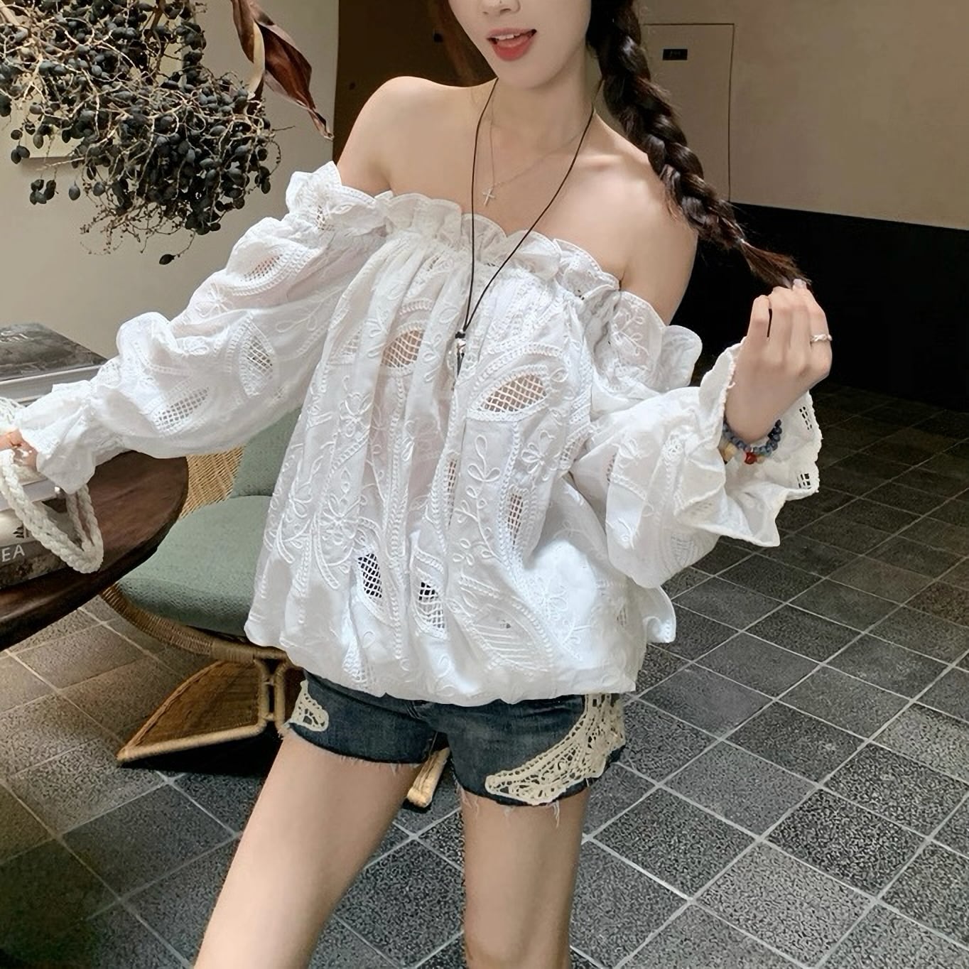 肩出し レース シフォン シャツ セクシー