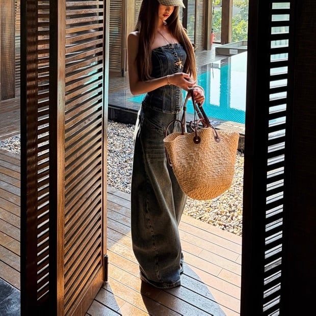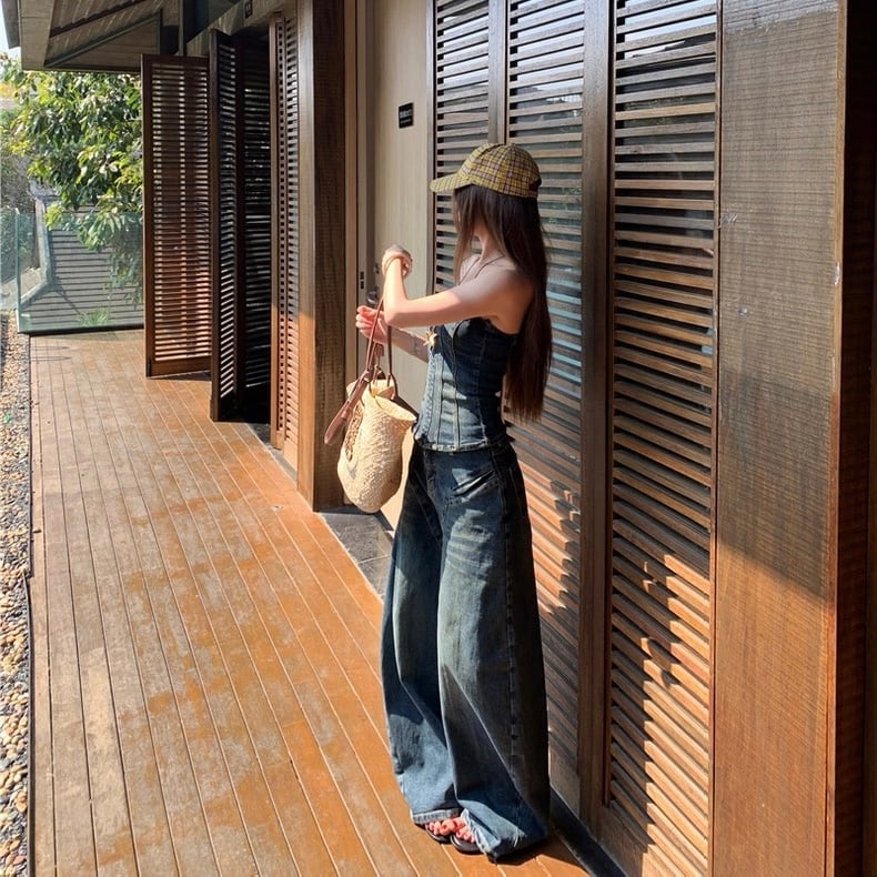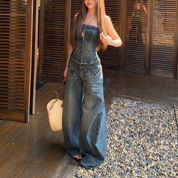 Denim baretop&pants set up