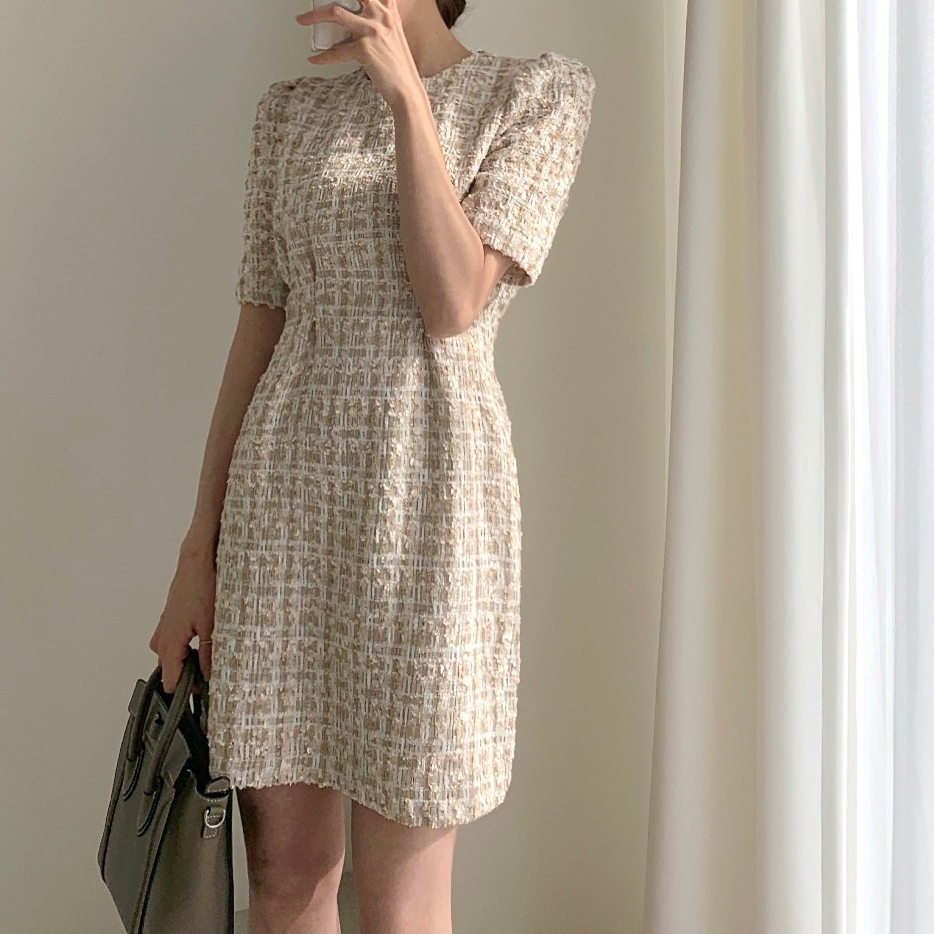 セクシー パール ツイード Aライン パフスリ