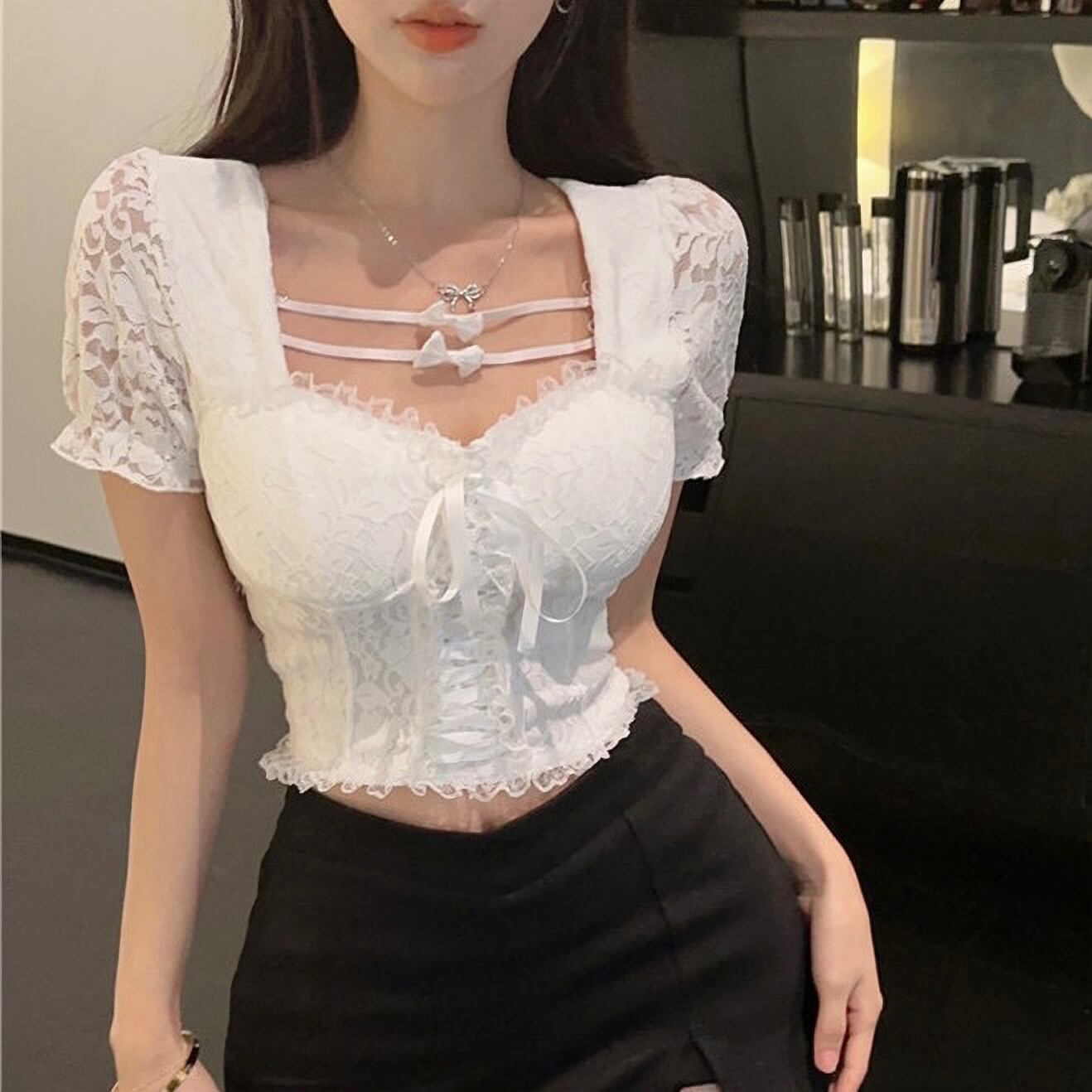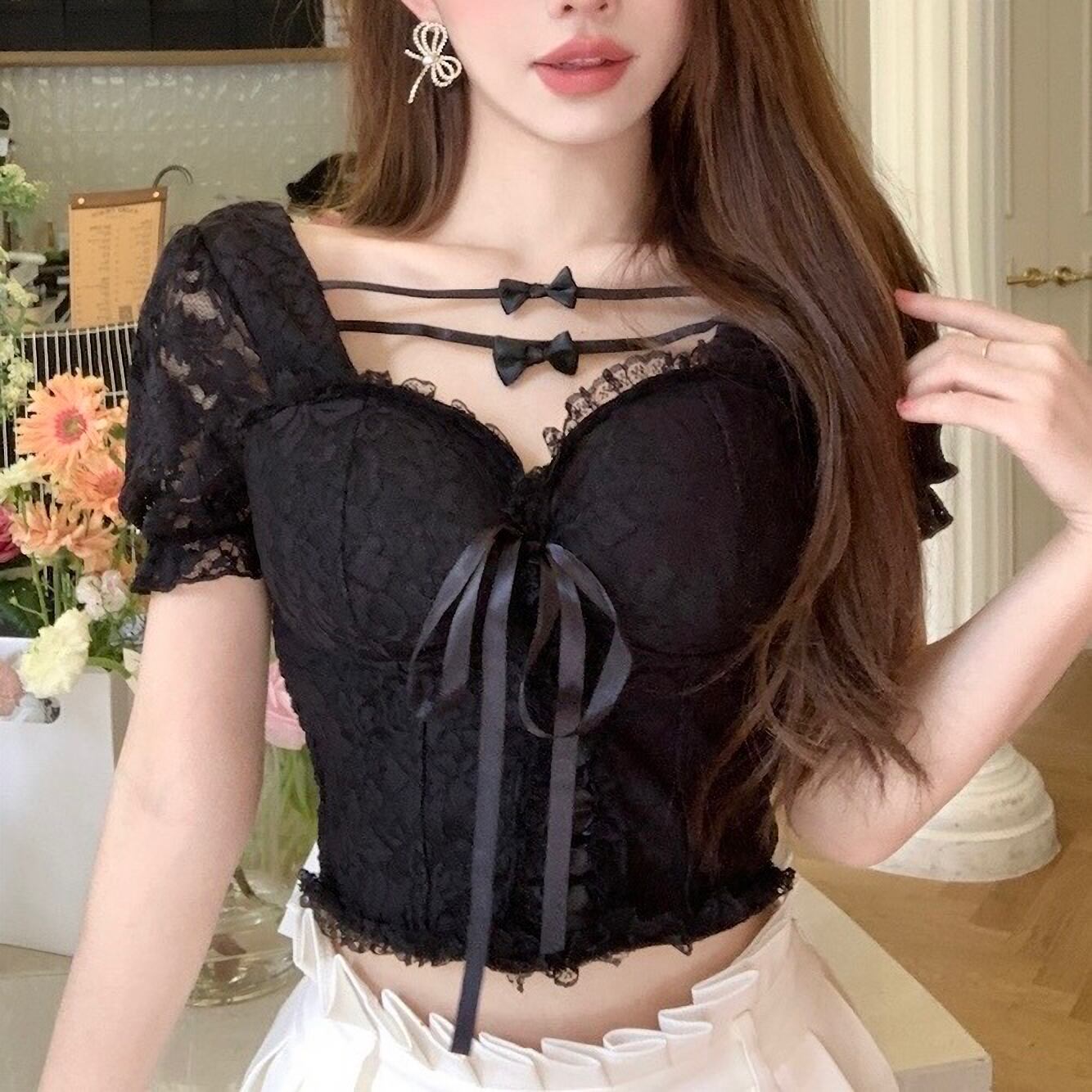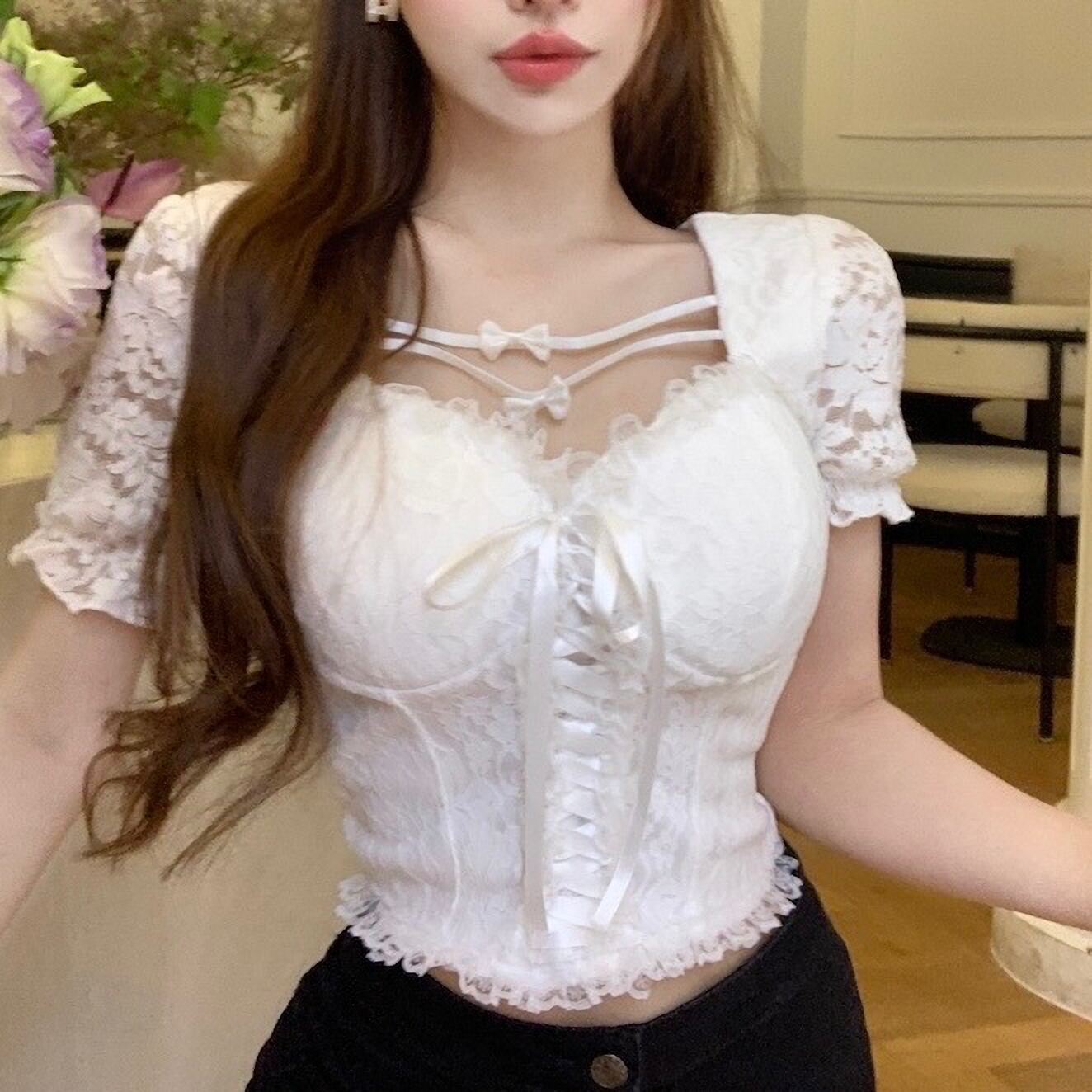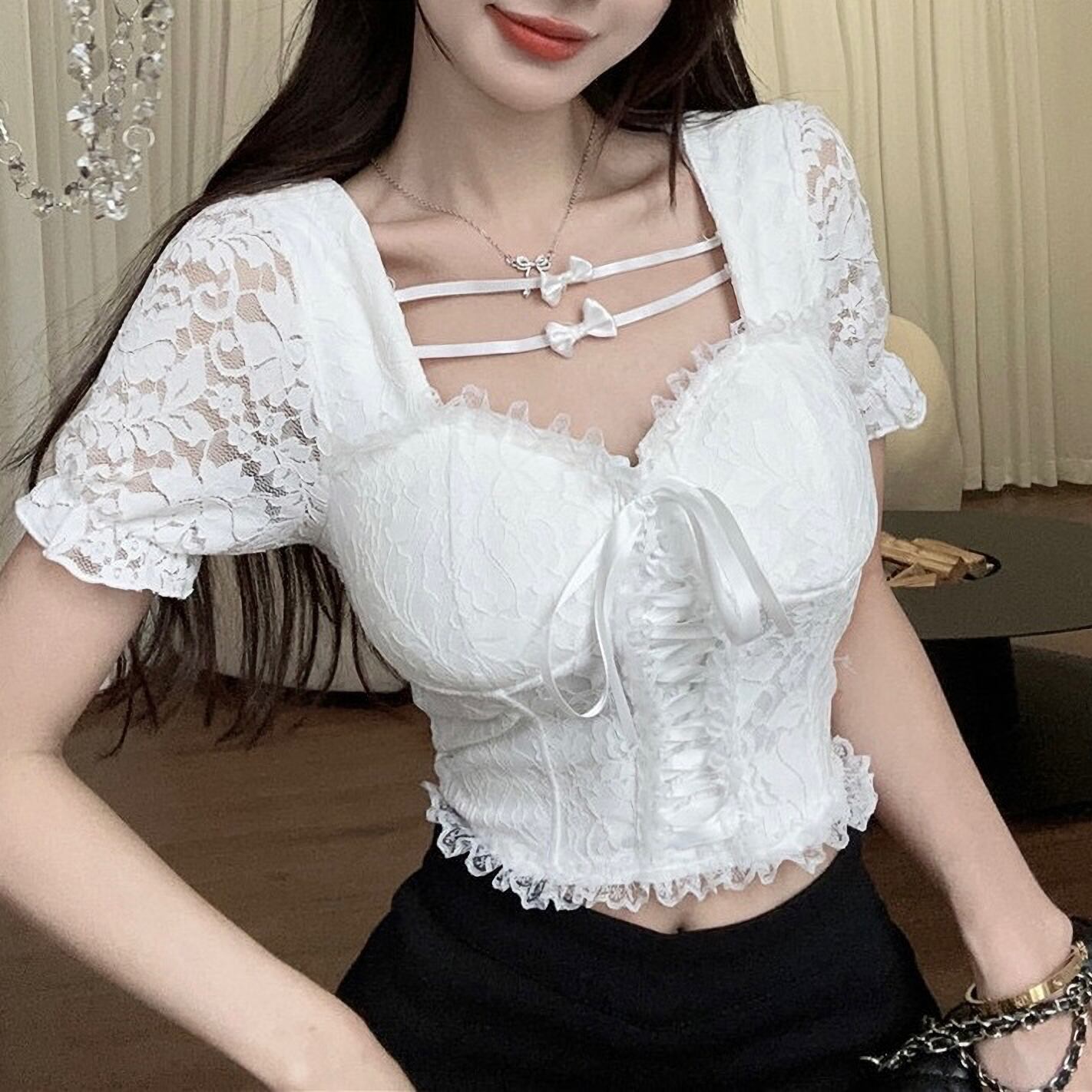 トップス 上品 韓国 量産型 地雷系 夏 半 レース