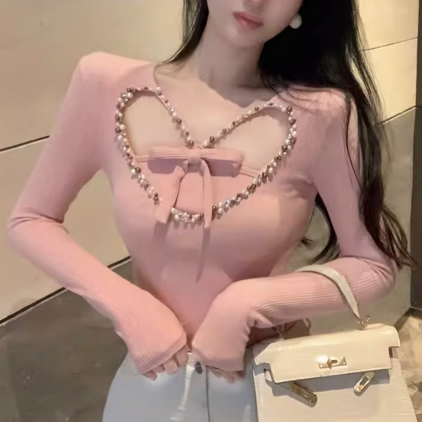 韓国ファッション セクシー リボン えちかわ 胸あき 胸開き カットアウト デコルテ ハート リボン