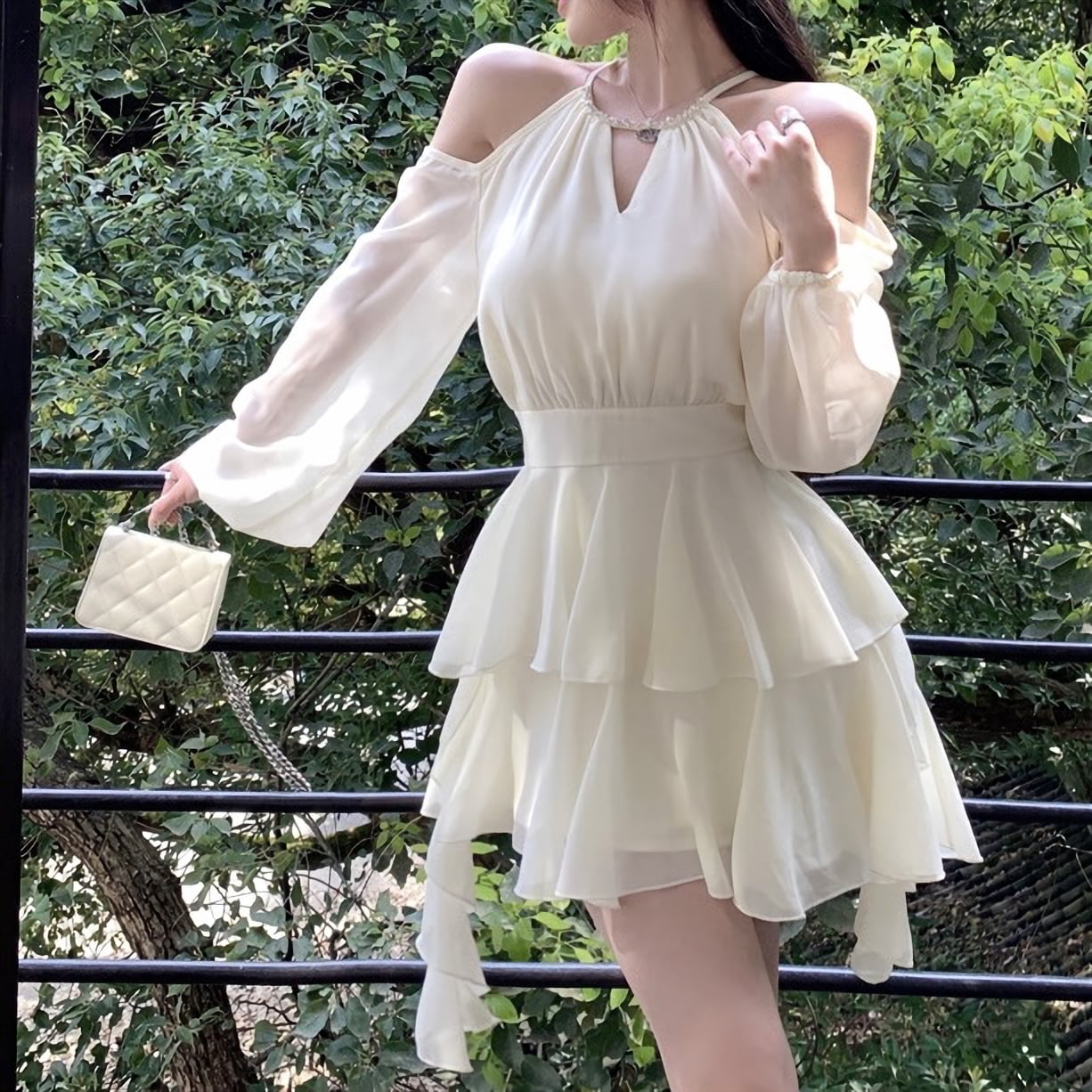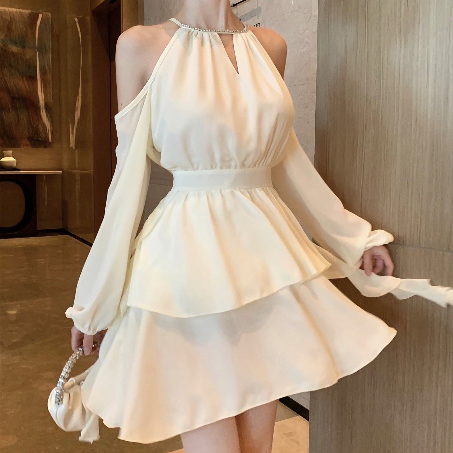 カットアウト パール 真珠 オープンショルダー